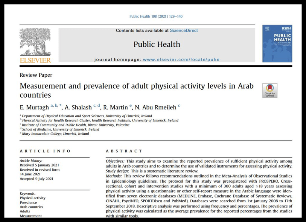 Murtagh, E., Shalash, A., Martin, R., & Abu Rmeileh, N. (2021). Measurement and prevalence of adult physical activity levels in Arab countries. Public Health, 198, 129-140. DOI: 10.1016/j.puhe.2021.07.010