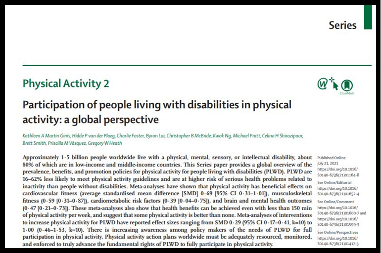 Ginis, K.A.M., van der Ploeg, H.P., Foster, C., Lai, B., McBride, C.B., Ng, K., Pratt, M., Shirazipour, C.H., Smith, B., Vásquez, P.M. and Heath, G.W., 2021. Participation of people living with disabilities in physical activity: a global perspective. The Lancet.
