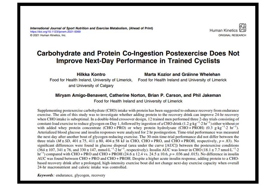 Kontro, H.,Kozior, M., Whelehan, G., Amigo-Benavent, M., Norton, C., Carson, B.P., & Jakeman, P. (2021). Carbohydrate and Protein Co-Ingestion Postexercise Does Not Improve Next-Day Performance in Trained Cyclists. International Journal of Sport Nutrition and Exercise Metabolism. Advance online publication. https://doi.org/10.1123/ijsnem.2021-0069.