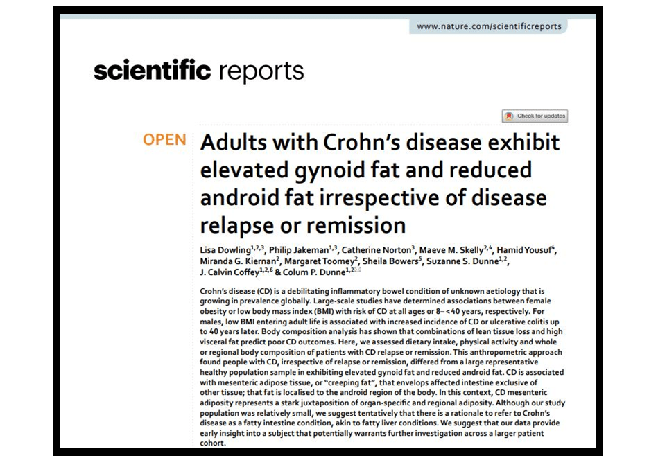 Dowling L, Jakeman P, Norton C, Skelly MM, Yousuf H, Kiernan MG, Toomey M, Bowers S, Dunne SS, Coffey CJ, Dunne CP. Adults with Crohn’s disease exhibit elevated gynoid fat and reduced android fat irrespective of disease relapse or remission. Scientific Reports. 2021;11(1):19258. https://doi.org/10.1038/s41598-021-98798-9