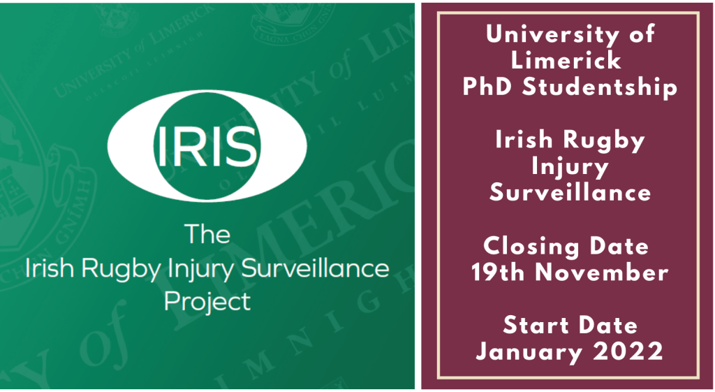 Applications are invited for a PhD studentship funded by the Irish Rugby Football Union to start in January 2022. The project will be based in the Department of Physical Education and Sport Sciences at the University of Limerick. The successful candidate will be supervised by Dr. Tom Comyns, Dr. Ian Kenny and Dr. Kieran O’Sullivan from the University of Limerick, in collaboration with the Irish Rugby Football Union Medical Department. The aims of the PhD will be: