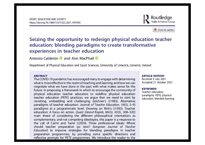 Calderón, A., & MacPhail, A., (2021). Seizing the opportunity to redesign physical education teacher education: blending paradigms to create transformative experiences in teacher education. Sport, Education and Society. https://doi.org/10.1080/13573322.2021.1997981 IF2020=4.119 (Q1) Education and Educational Research (JCR)