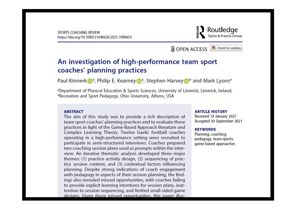 Kinnerk, P., Harvey, S., Kearney, P., and Lyons, M. (2021) An investigation of team sport coaches’ planning practices in a high-performance setting: A pedagogical perspective. Sports Coaching Review 2. DOI: 10.1080/21640629.2021.1990653.