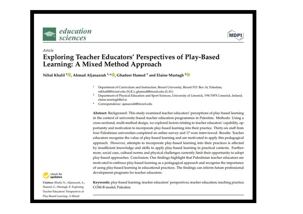 Khalil, N., Aljanazrah, A., Hamed, G., & Murtagh, E. (2022). Exploring Teacher Educators’ Perspectives of Play-Based Learning: A Mixed Method Approach. Education Sciences, 12(2), 95. doi: https://doi.org/10.3390/educsci12020095