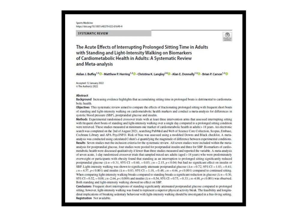 Buffey, A.J., Herring, M.P., Langley, C.K., Donnelly, A.E. and Carson, B.P. (2022). The Acute Effects of Interrupting Prolonged Sitting Time in Adults with Standing and Light-Intensity Walking on Biomarkers of Cardiometabolic Health in Adults: A Systematic Review and Meta-analysis. Sports Medicine. https://doi.org/10.1007/s40279-022-01649-4