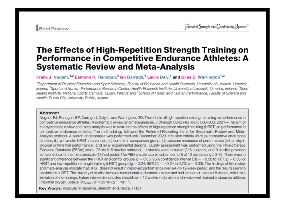 Nugent, F.J., Flanagan, E.P., Darragh, I., Daly, L. and Warrington, G.D., 2022. The Effects of High-Repetition Strength Training on Performance in Competitive Endurance Athletes: A Systematic Review and Meta-Analysis. The Journal of Strength & Conditioning Research (In press). (IF = 3.929; Q2; Sport Sciences; R = 25/88). DOI: 10.1519/JSC.0000000000004217
