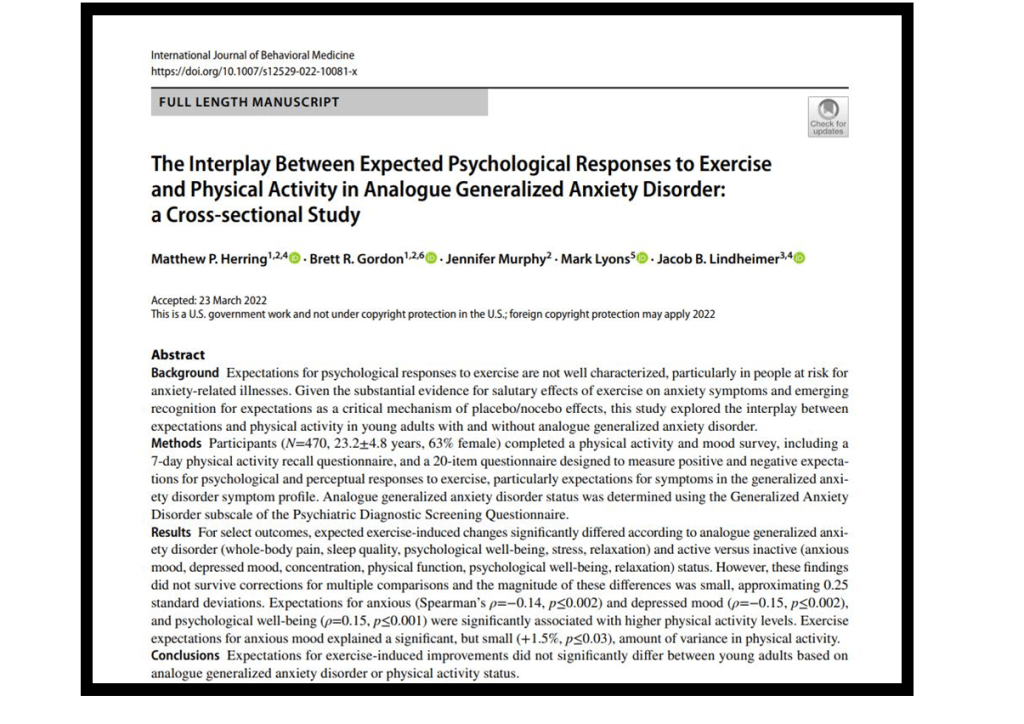 Herring MP, Gordon BR, Murphy J, Lyons M, Lindheimer JB (2022). Physical activity and analogue generalized anxiety disorder status among young adults: Potential role of exercise expectations. International Journal of Behavioral Medicine, DOI: 10.1007/s12529-022-10081-x. (IF: 2.229; C=; Q2 Clinical Psychology; R=85/130).