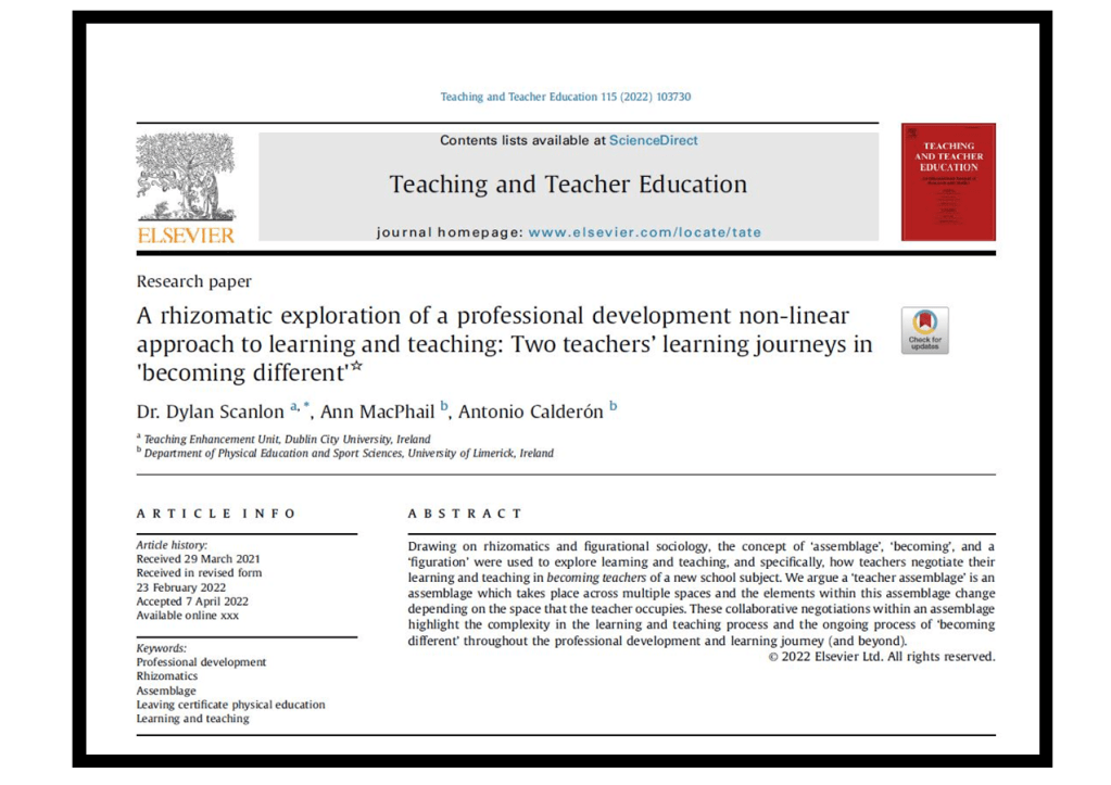 Scanlon, D., MacPhail, A., & Calderón, A. (2022). A rhizomatic exploration of a professional development non-linear approach to learning and teaching: Two teachers’ learning journeys in ‘becoming different’. Teaching and Teacher Education, 115. https://doi.org/10.1016/j.tate.2022.103730
