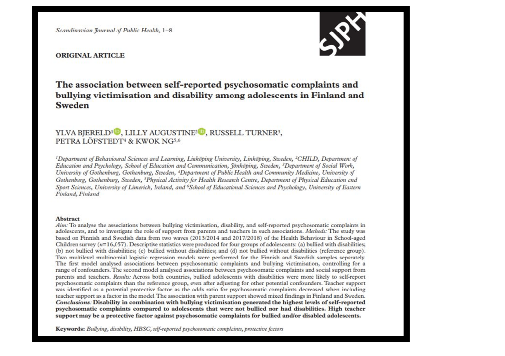 Bjereld, Y., Augustine, L., Turner, R., Löfstedt, P. and Ng, K., 2022. The association between self-reported psychosomatic complaints and bullying victimisation and disability among adolescents in Finland and Sweden. Scandinavian journal of public health, p.14034948221089769. DOI: 10.1177%2F14034948221089769