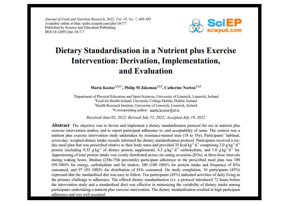 Kozior, M., Jakeman, P.M. and Norton, C., 2022. Dietary Standardisation in a Nutrient plus Exercise Intervention: Derivation, Implementation, and Evaluation. Journal of Food and Nutrition Research, 10(7), pp.488-495. DOI:10.12691/jfnr-10-7-7