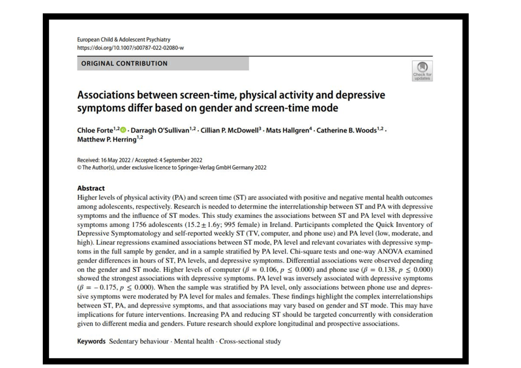 Forte, C., O’Sullivan, D., McDowell, C. P., Hallgren, M., Woods, C. B., & Herring, M. P. (2022). Associations between screen-time, physical activity and depressive symptoms differ based on gender and screen-time mode. European Child & Adolescent Psychiatry, 1 10.https://doi.org/10.1007/s00787-022-02080-w. Impact factor: 5.28; Q1