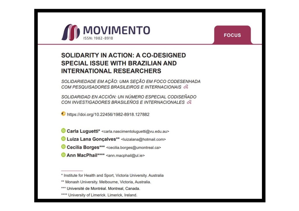 Luguetti, C., Gonçalves, L.L., Borges, C. and MacPhail, A., 2022. SOLIDARITY IN ACTION: A CO-DESIGNED SPECIAL ISSUE WITH BRAZILIAN AND INTERNATIONAL RESEARCHERS. Movimento, 28, p.e28070. DOI:10.22456/1982-8918.127882