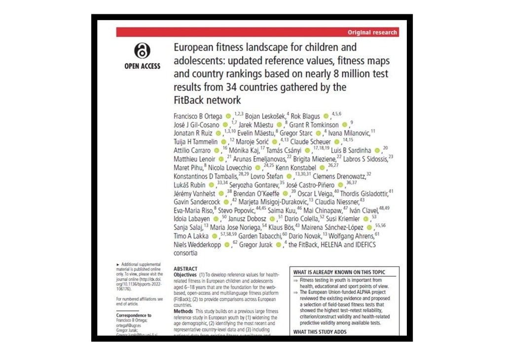 Ortega FB, Leskošek B, Blagus R,.. O’Keeffe B, et al (2023) European fitness landscape for children and adolescents: updated reference values, fitness maps and country rankings based on nearly 8 million test results from 34 countries gathered by the FitBack network. British Journal of Sports Medicine. DOI: 10.1136/bjsports-2022-106176 (Available open access here).