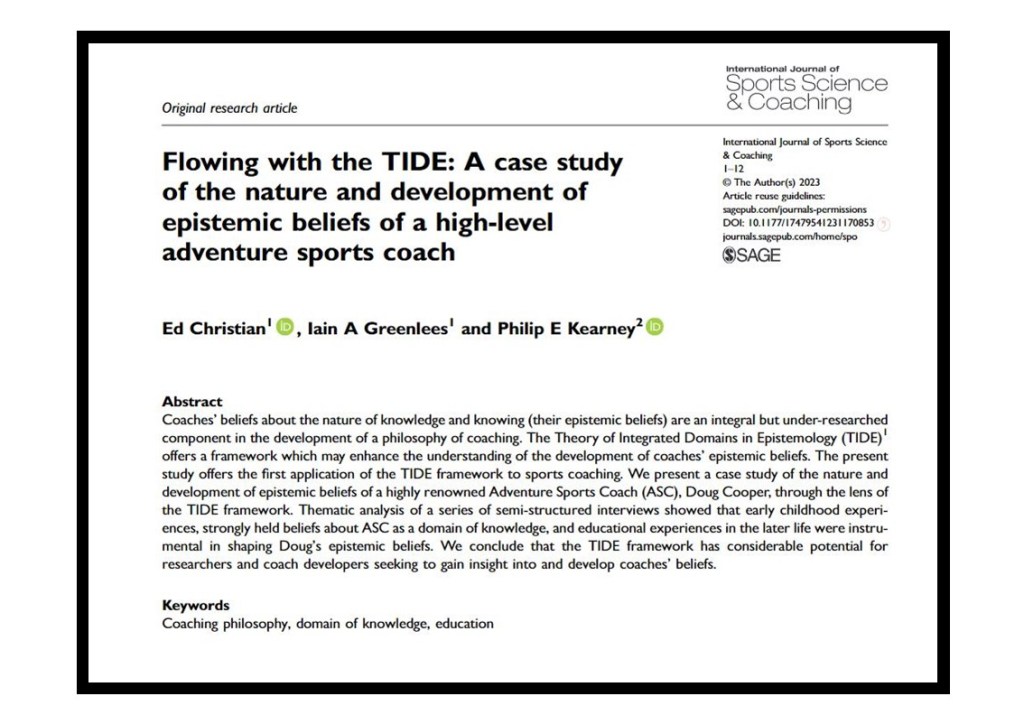 Christian, E., Greenlees, I.A. and Kearney, P.E., 2023. Flowing with the TIDE: A case study of the nature and development of epistemic beliefs of a high-level adventure sports coach. International Journal of Sports Science & Coaching, p.17479541231170853.