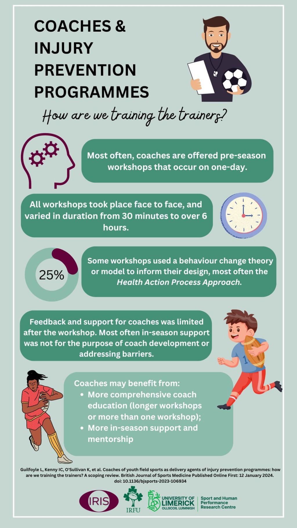 Much attention has been paid to the creation of programmes to help sports coaches address the number of injuries their players sustain each season. For example, FIFA 11+ is designed with soccer players in mind. These programmes consist of a selection of exercises and drills that typically are used as a warm-up and coaches are often the designated person ensuring players engage in these programmes alongside their other sport activities. We know that these injury prevention programmes are effective at reducing injury rates when they are completed 3 times per week, however the benefits of these programmes are diluted when players are not exposed to or do not engage with this programme as often. Coaches often provide reasons why they find it difficult to implement the programmes in the ‘real-world’ context and these include lack of time or lack of organisational supports. In addition, coaches often cite barriers related to their own ability to deliver these programmes, so we examined how coaches are being supported in the adoption and delivery of these programmes.