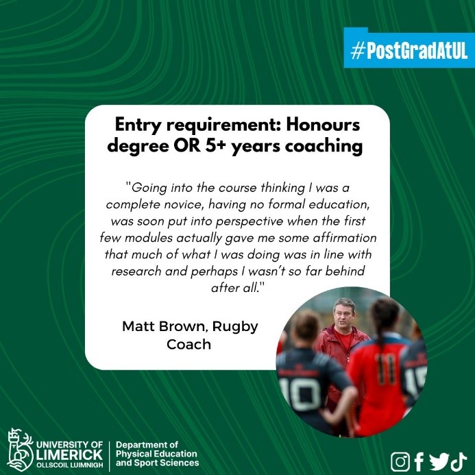 A course overview is available here, or you can take a look at #MScAppliedSportsCoachingUL where you will find insights such as exemplar pre-course activities and examples of the type of research we will be engaging with. You can also explore these FAQs.
