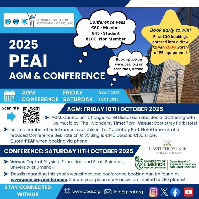 Registration for the 2025 PEAI Conference on Friday October 10th (Castletroy Park Hotel) and Saturday October 11th (University of Limerick) is NOW OPEN! This is the flagship professional development for all things Physical Education in Ireland. Over 100 tickets are already sold. The cheapest way to register is to join as a PEAI member (€25) or student member (€10) and purchase your ticket (€60 for a full member; €45 for a student). Non-member tickets are €100. Places are strictly limited to 250 attendees, with each workshop capped at 30 participants. These workshops are assigned on a first come, first served basis. The Conference is expected to sell out fast, so please do not delay in booking your place! Also, there are a limited number of rooms in the Castletroy Park Hotel at a discounted conference rate, quote PEAI Conference when booking. We have a jam-packed conference schedule on both the Friday night & Saturday. The Full conference programme available on https://peai.org/conference/. Some conference highlights include; · 30+ Professional Development Workshops · Keynote panel discussions Friday and Saturday · Music & Finger Food on the Friday evening & Lunch on Saturday · Conference Resource Pack with PEAI goodies · Access to all digital resources from · 30 workshops Attendee physical activity challenges and spot prizes from our exhibitors · ….and much, much more! For all inquiries, please contact us at info@peai.org. Book now at the link below – https://www.peai.org/conference/