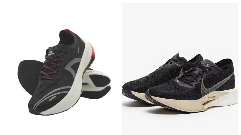 The shoe’s on the other foot: Lidl’s Crivit carbon-plated running shoe (left) and Nike’s Vaporfly 3 (right). Photo: PR