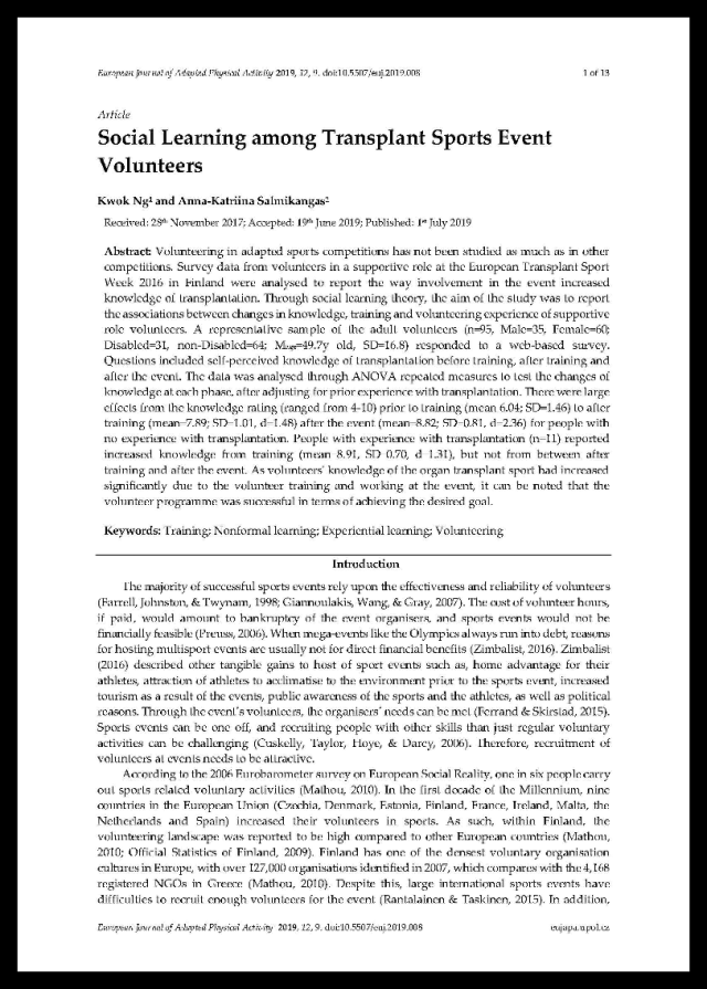 Research Impact: The success of sport events rely heavily on volunteers. In particular games with athletes with special needs, like those with organ transplants, the volunteers require training to be competent to support the athletes. […]