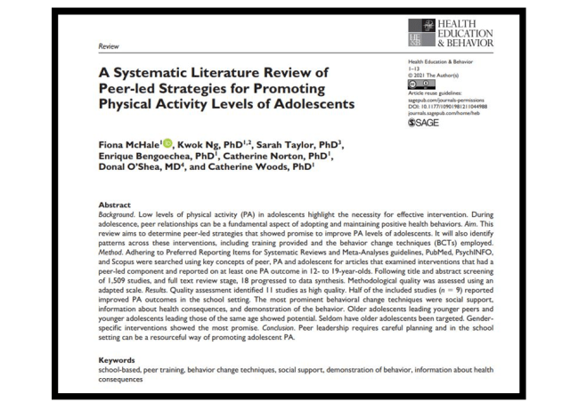 Low levels of physical activity (PA) in adolescents highlight the necessity for effective intervention. During adolescence, peer relationships can be a fundamental aspect of adopting and maintaining positive health behaviours. This review aims to determine peer-led […]