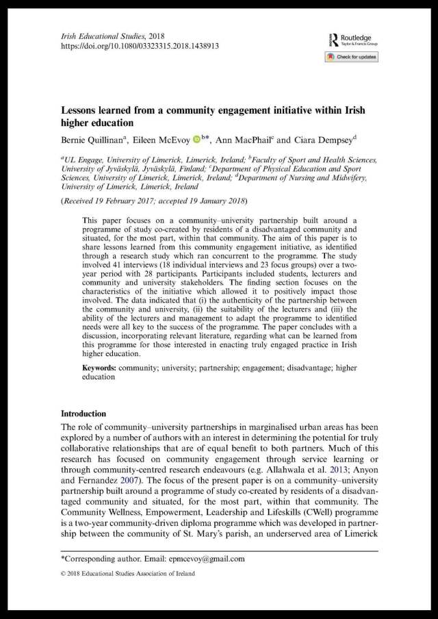 Research Impact: This paper focuses on a community–university partnership built around a programme of study co-created by residents of a disadvantaged community and situated, for the most part, within that community. The impact of the research […]