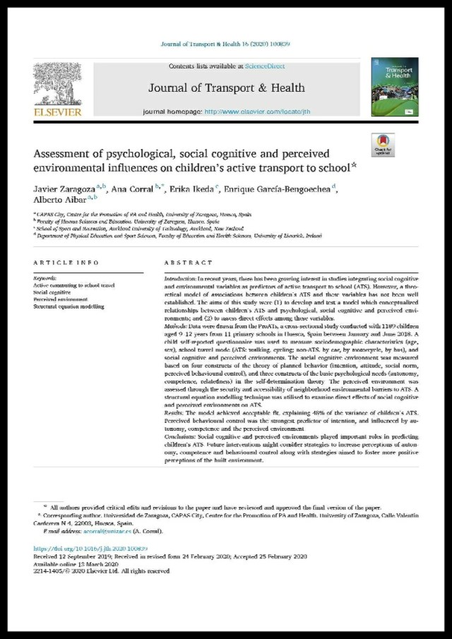Research Impact: Adolescents and their aspirations for private car-based transport has just been published in the journal Transportation (Springer) as an Open Access paper. The team (Debbie Hopkins, Enrique García Bengoechea and Sandra Mandic) use […]